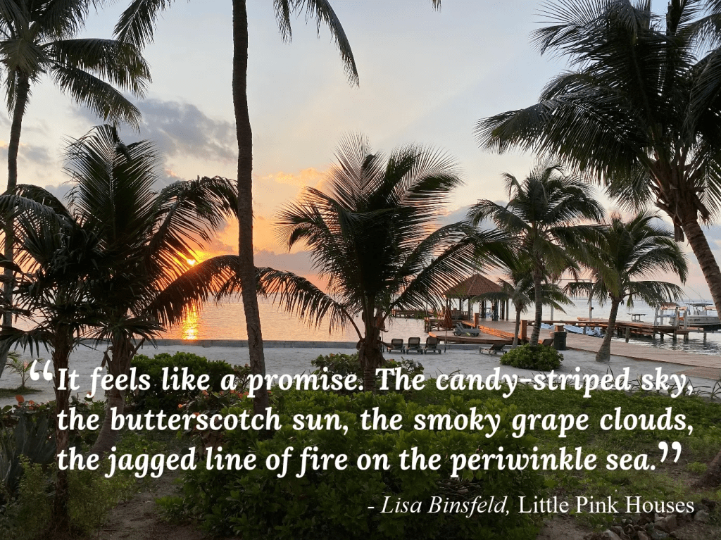 As I write, I’m watching the sunrise IN BELIZE! Revisiting places that inspired my novel, recreating character moments, handing out bookmarks and postcards as if I’m part of a salvation mission, posing for pictures like a twenty-year-old wannabe influencer, and generally driving two of my oldest, dearest friends crazy tying everything we see, hear, eat and do to something in my book. The image above, in fact, is the view my protagonist, Cole, would have had the first morning from her Grand Caribe condo.